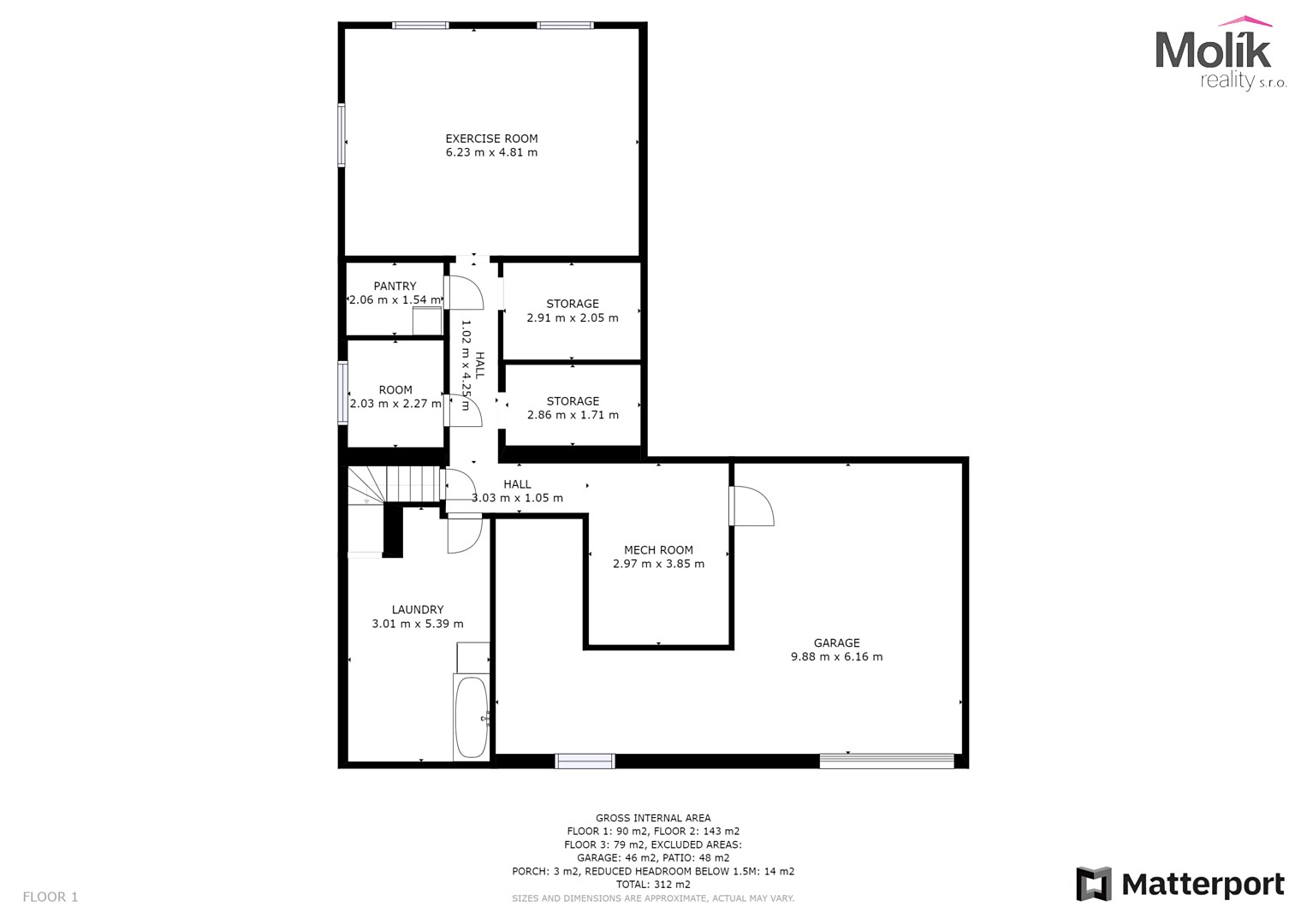 1.PP (90m²+ garáž 46m² ) - garáž, technická místnost, fitko, 3x špajz, pracovna, prádelna.